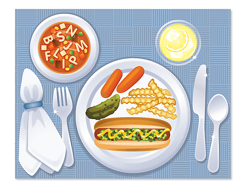 Fill a place setting with your dream meal. You can choose anything you like--donuts for dinner, fruit piled high or pasta and more pasta!